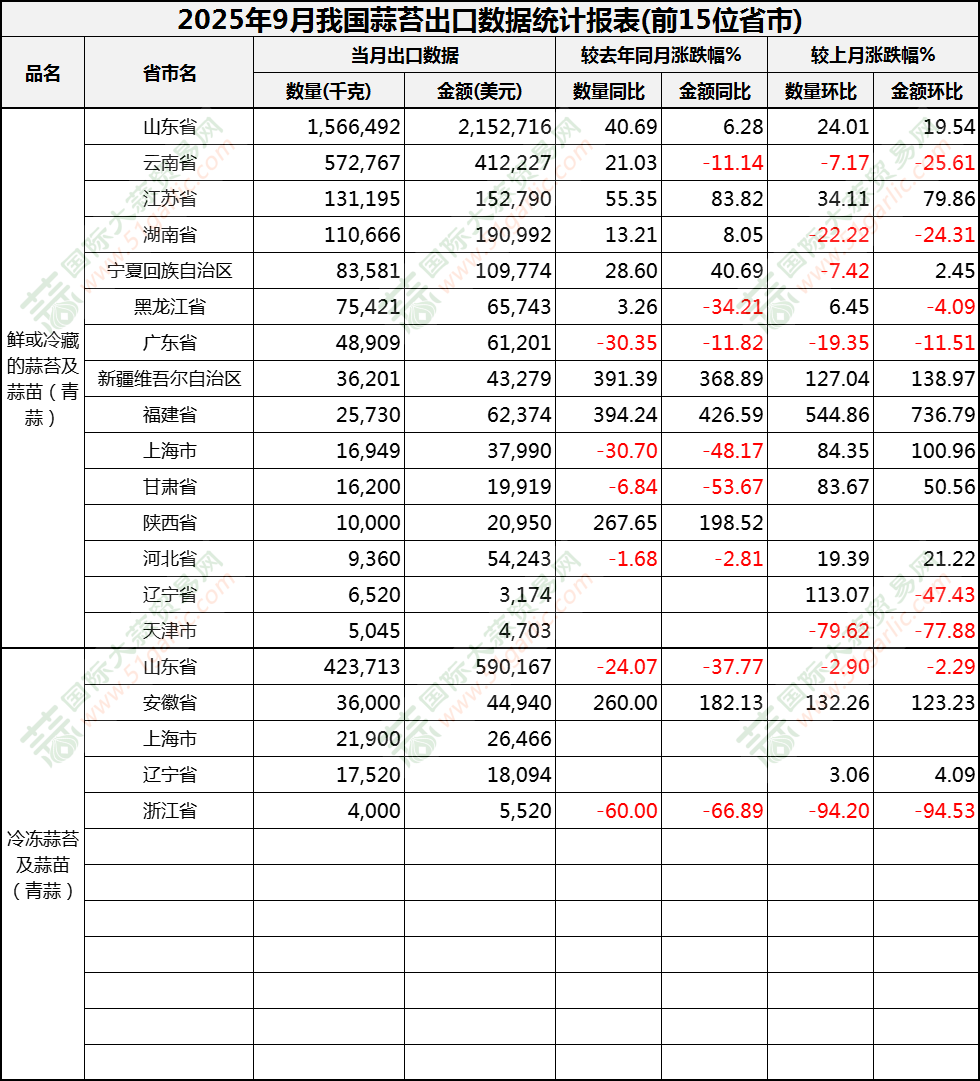 2025年9月蒜苔出口數(shù)據(jù)(按省市)