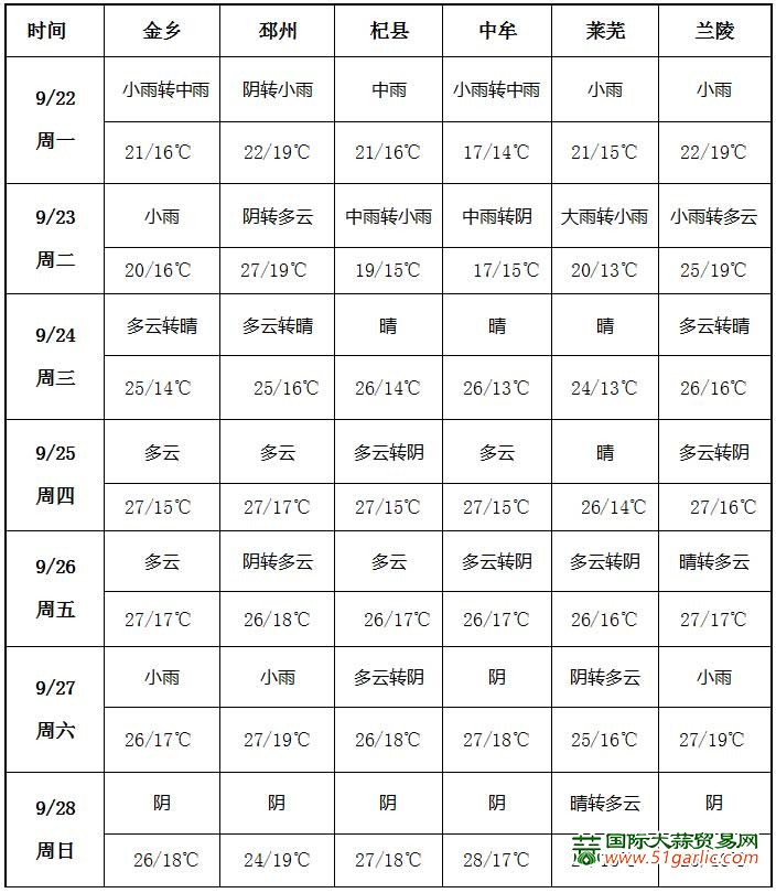 本周,大蒜產(chǎn)區(qū)普遍呈現(xiàn)多云及陰雨天氣,整體氣溫相對(duì)偏低。金鄉(xiāng)、邳州、杞縣、中牟等產(chǎn)區(qū),降水主要集中在前期和后期,前期多小雨、中雨天氣,后期也有小雨出現(xiàn),中期則以多云或晴好天氣為主。氣溫方面,最高溫大多在 20 - 28℃之間,最低溫基本處于 13 - 19℃范圍。持續(xù)的降雨或大雨可能導(dǎo)致田間積水,進(jìn)而影響大蒜的正常播種,并可能致使部分產(chǎn)區(qū)的種植時(shí)間被迫延后。